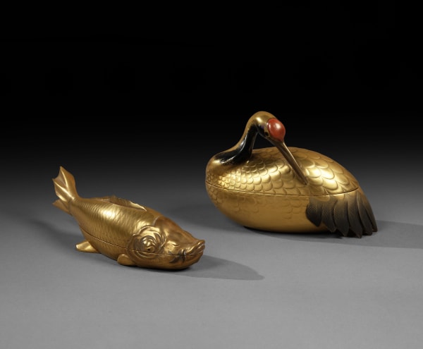 • BOXES IN THE FORMS OF A CRANE AND OF A FISH