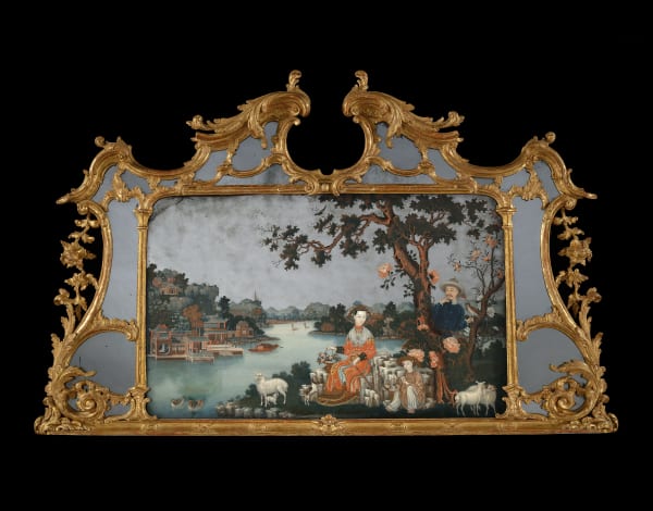 A CHINESE EXPORT REVERSE-PAINTED MIRROR DEPICTING THE SHEPHERDESS AND FALCONER