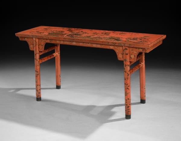 A RED LACQUER AND POLYCHROME DECORATED RECESSED LEG TABLE -